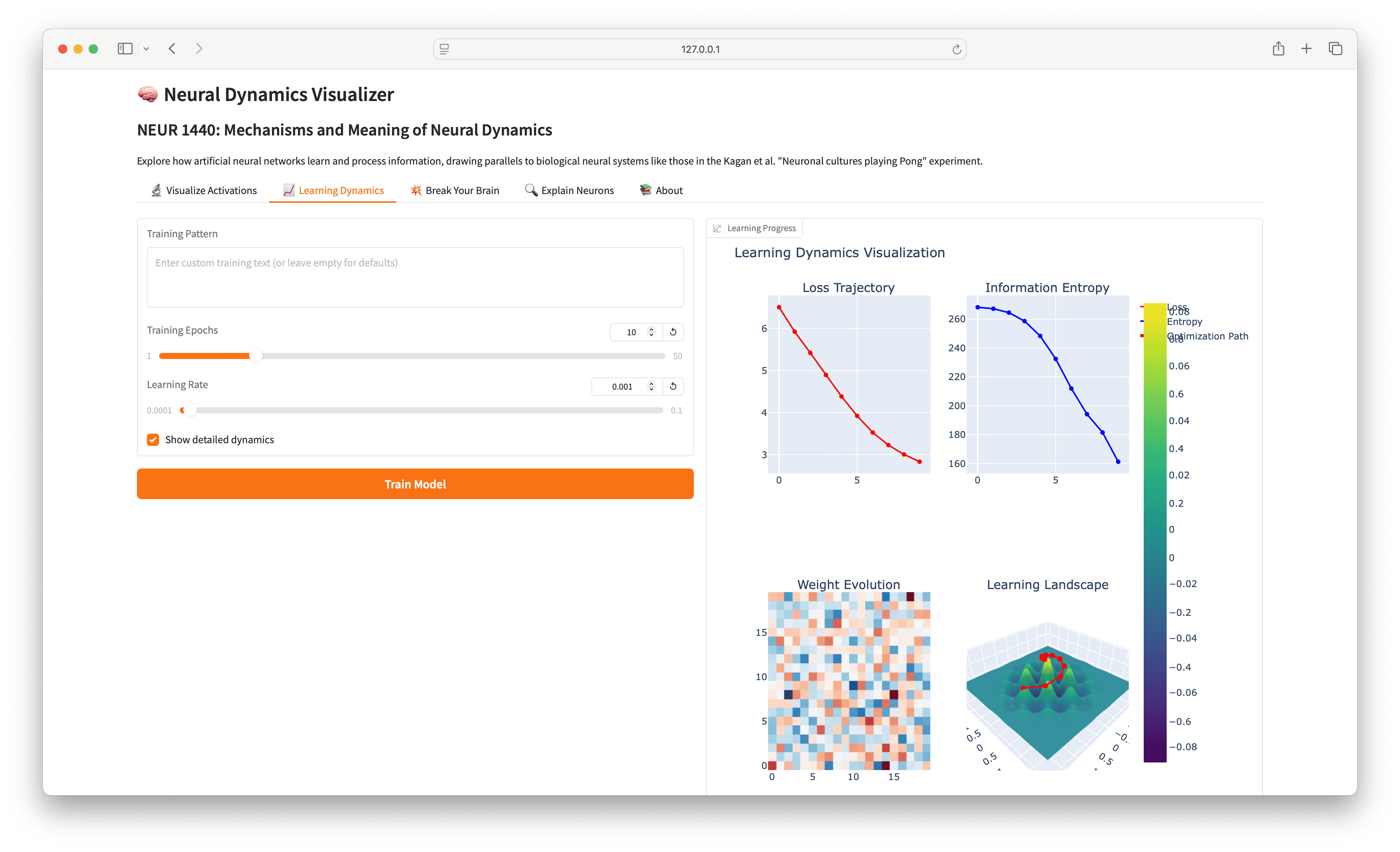 Created hands-on learning tools for NEUR 1440: Mechanisms and Meaning of Neural Dynamics. Students explore real-time neural activations, learning dynamics, and biological-artificial parallels inspired by neurons learning to play Pong.